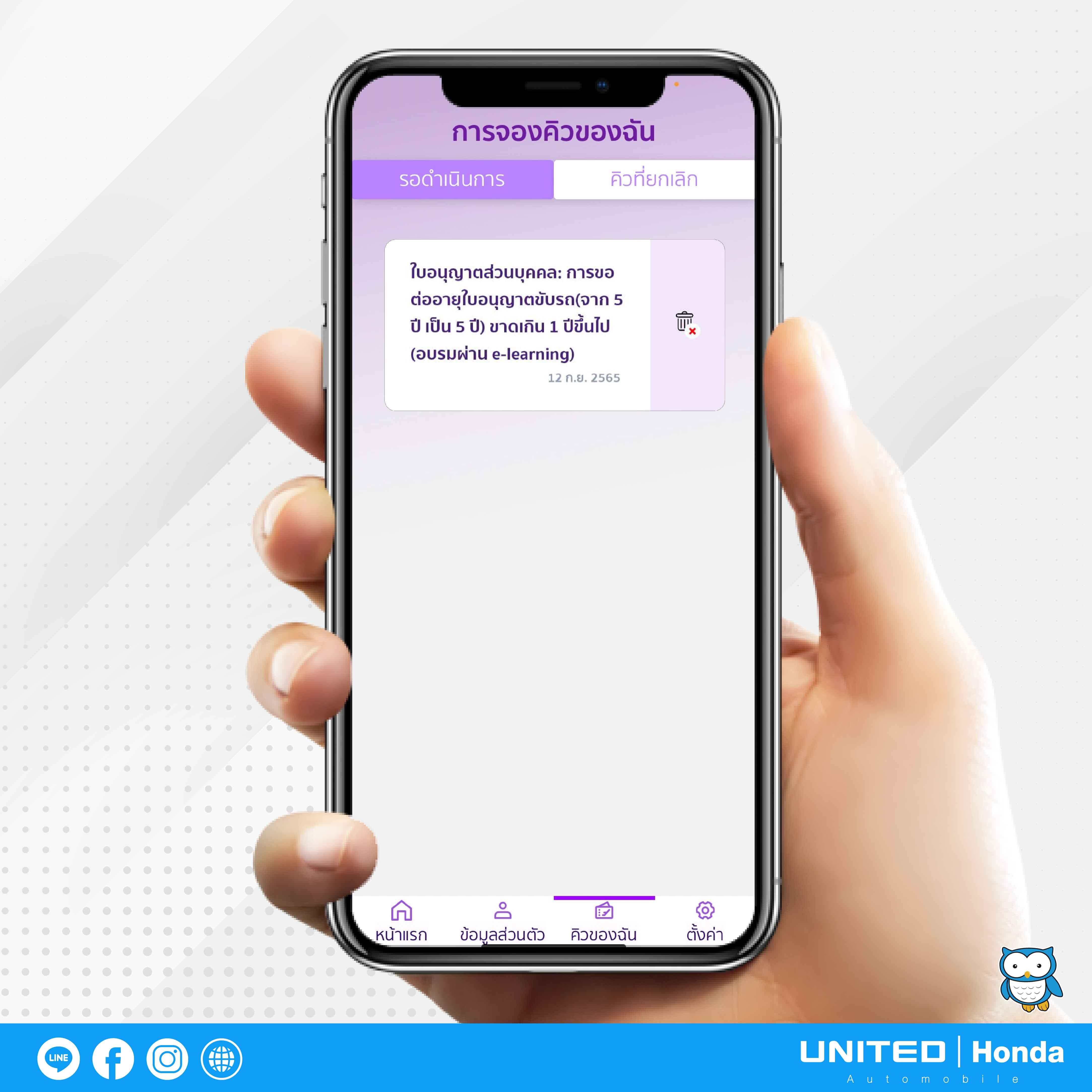 - ในหน้านี้จะขึ้นรายละเอียดการจองคิวทั้งหมด หากต้องการยกเลิกให้กดที่ไอคอนรูป “ถังขยะ” ได้เลย
