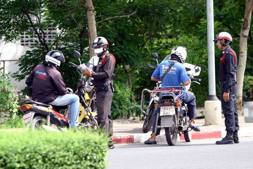 - ผู้ขับขี่และผู้โดยสารมอเตอร์ไซค์จะต้องสวมหมวกนิรภัย (หมวกที่จัดทำขึ้นโดยเฉพาะเพื่อป้องกันอันตรายในขณะขับขี่และโดยสารรถจักรยานยนต์)
