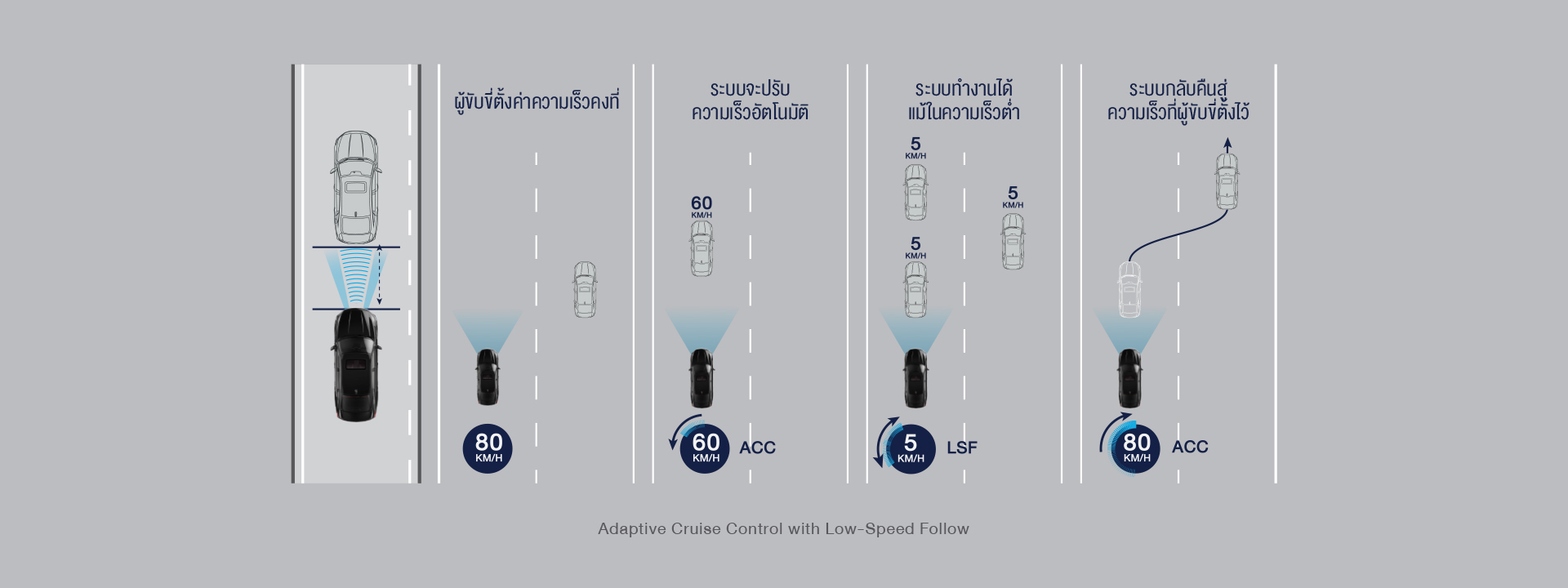 - ระบบควบคุมความเร็วอัตโนมัติแบบแปรผัน พร้อมระบบปรับความเร็วตามรถยนต์คันหน้าที่ความเร็วต่ำ (Adaptive Cruise Control with Low-Speed Follow: ACC with LSF)