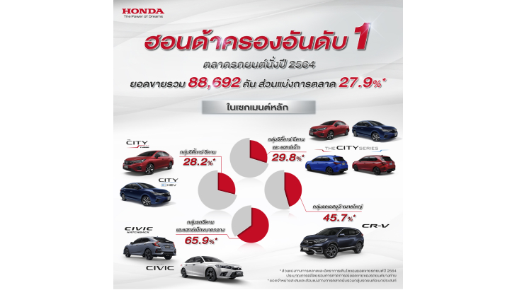 ตอกย้ำการเป็นแบรนด์ยอดนิยม ฮอนด้า ได้คว้าอับดับ 1 ตลาดรถยนต์นั่งส่วนบุคคลปี 2564 ต่อเนื่องอีกปี ด้วยยอดจำหน่ายสะสมรวม 88,692 คัน ครองส่วนแบ่งทางการตลาด 27.9% ด้วยสถานการณ์การแพร่ระบาดของไวรัสโควิด-19 ทำให้มีการเปลี่ยนแปลงเพื่อให้สอดคล้องกับสถานการณ์ เพื่อตอบสนองความต้องการและพฤติกรรมของผู้ขับขี่หรือผู้ใช้รถยนต์ในปัจจุบัน