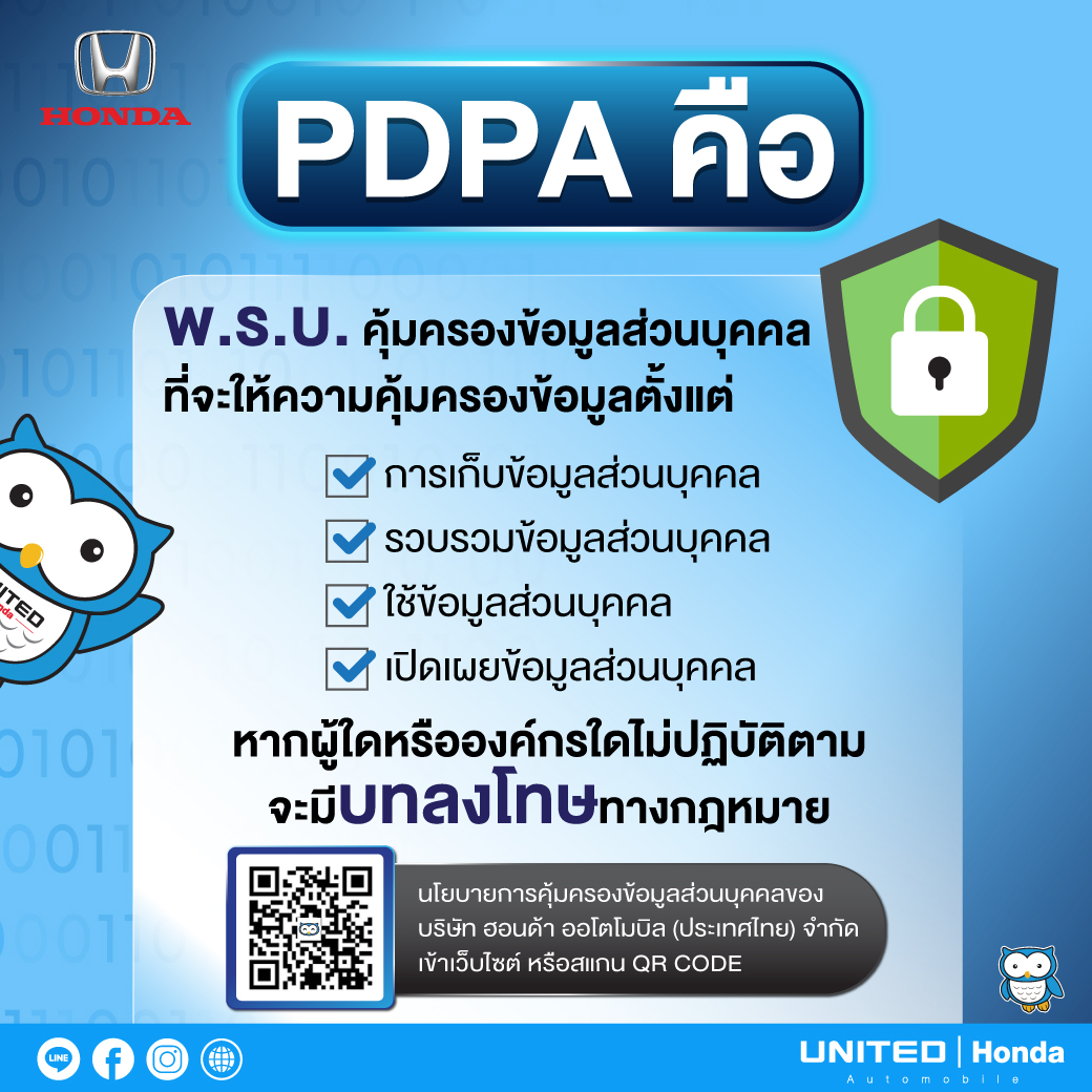 และสำหรับที่ ยูไนเต็ด ฮอนด้า ได้มีการดำเนินการตามนโยบายคุ้มครองข้อมูลส่วนบุคคลตาม พ.ร.บ. โดยบังคับใช้ตั้งแต่วันที่ 1 มิถุนายน 2565 หากต้องการทราบรายละเอียดเพิ่มเติมสามารถสแกน QR CODE ด้านล่างนี้ได้เลยนะครับ