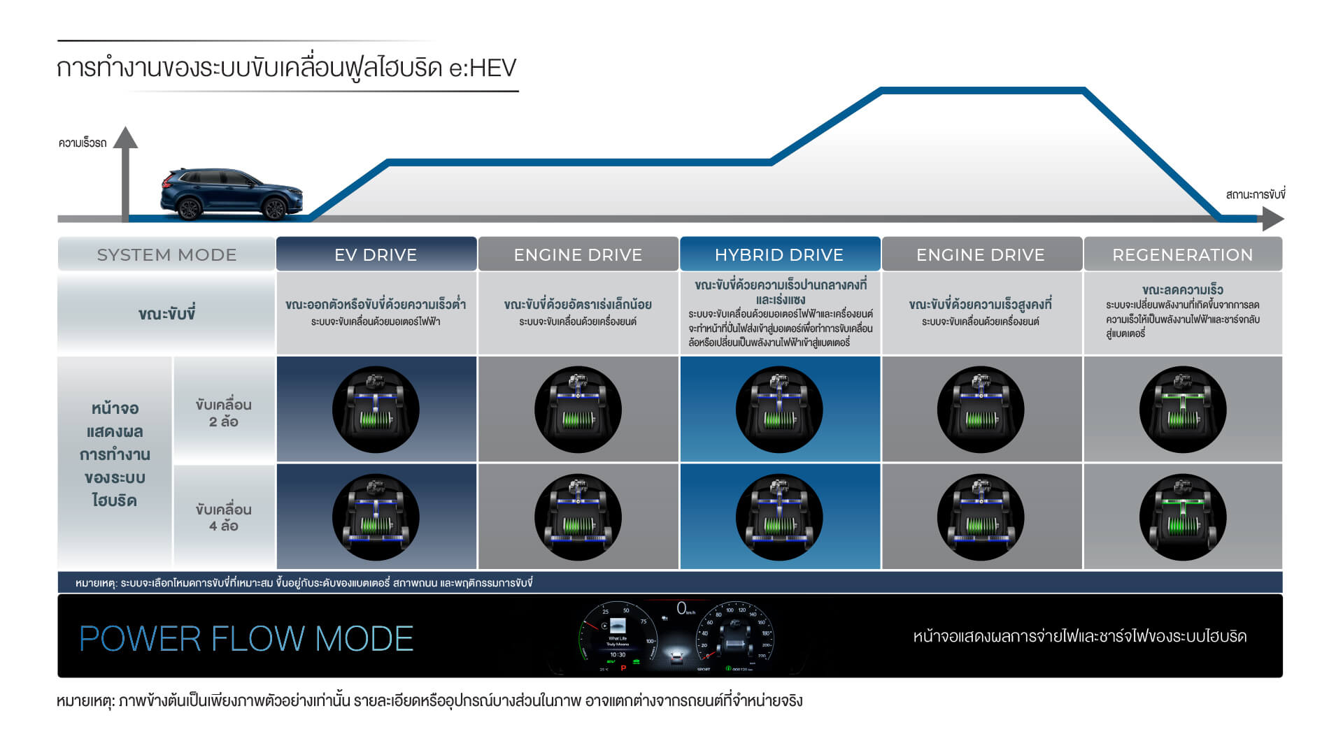 โดยระบบขับเคลื่อนฟูลไฮบริด e:HEV สามารถปรับเปลี่ยนโหมดการทำงานได้อย่างชาญฉลาด เหมาะสมกับการขับขี่ในทุกสถานการณ์ใน 3 โหมด ได้แก่