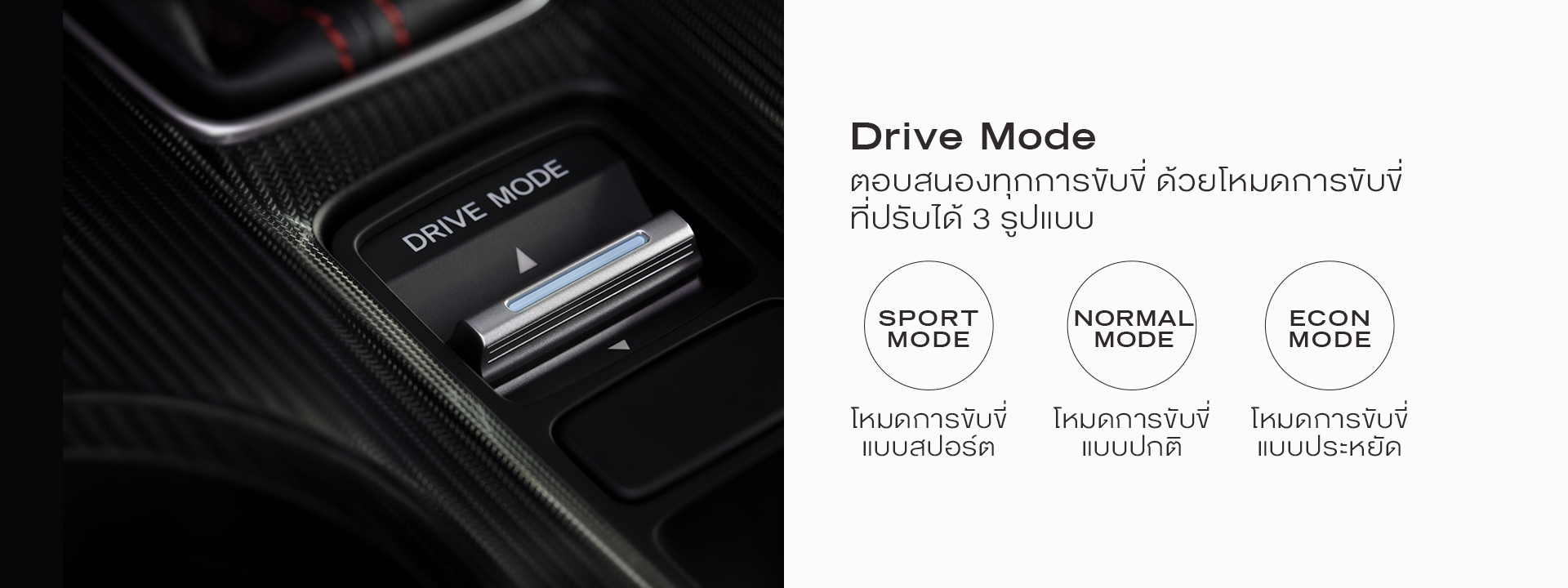 - ECON Mode - โหมดการขับขี่แบบประหยัด พร้อมปรับการทำงานของเครื่องยนต์ให้สัมพันธ์กับการขับขี่ เพื่ออัตราการประหยัดเชื้อเพลิงมากขึ้น