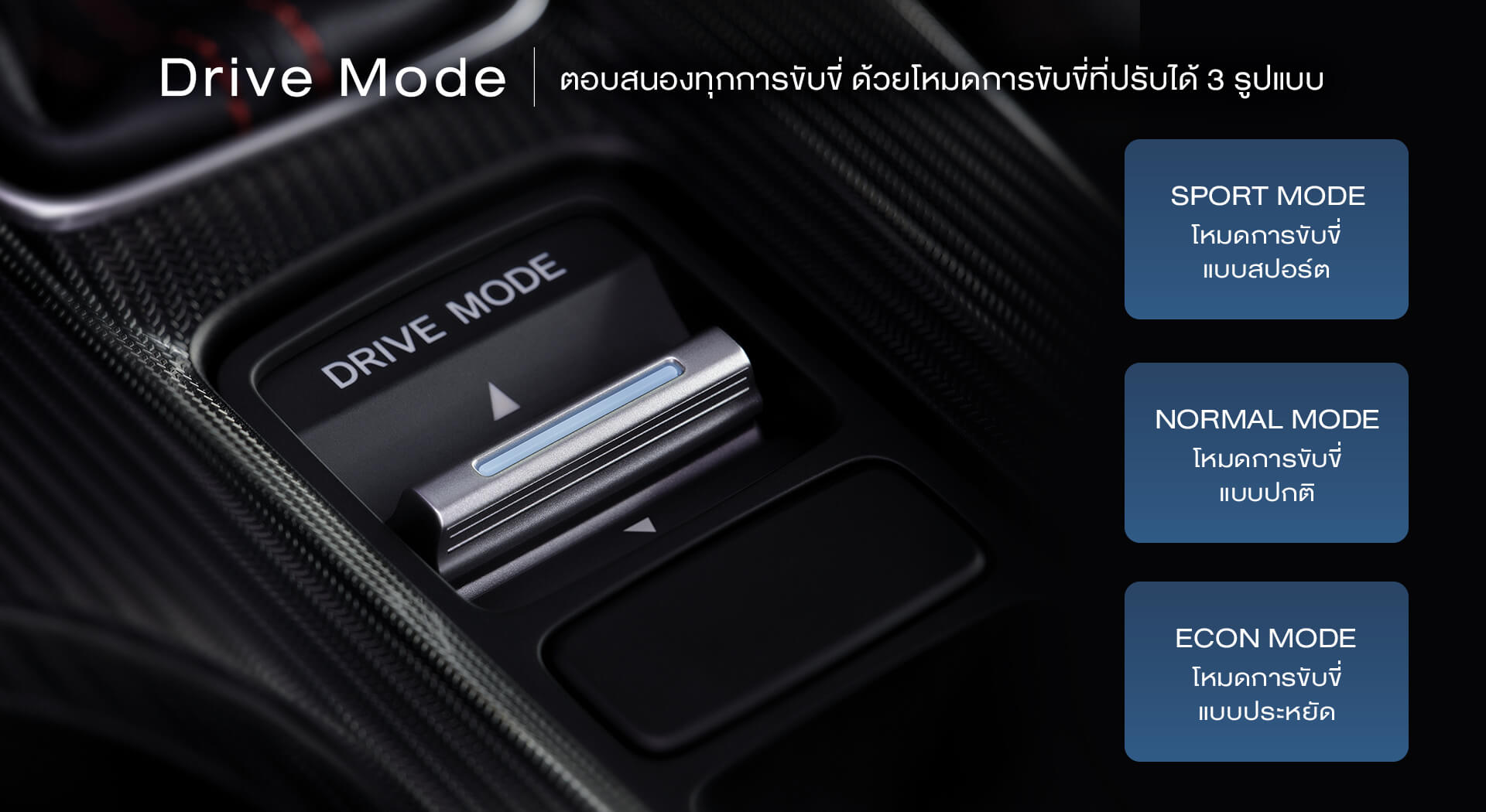 - ECON MODE โหมดการขับขี่แบบประหยัด พร้อมปรับการทำงานของเครื่องยนต์ให้สัมพันธ์กับการขับขี่เพื่ออัตราการประหยัดเชื้อเพลิงมากขึ้น