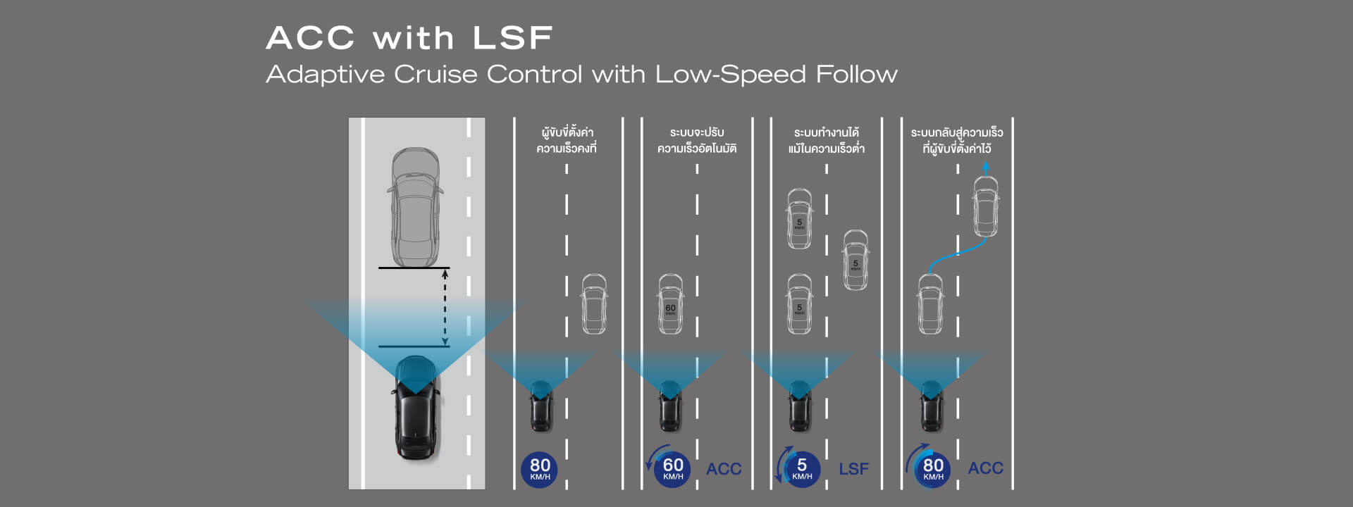 - ระบบควบคุมความเร็วอัตโนมัติแบบแปรผันพร้อมระบบปรับความเร็วตามรถยนต์คันหน้าที่ความเร็วต่ำ