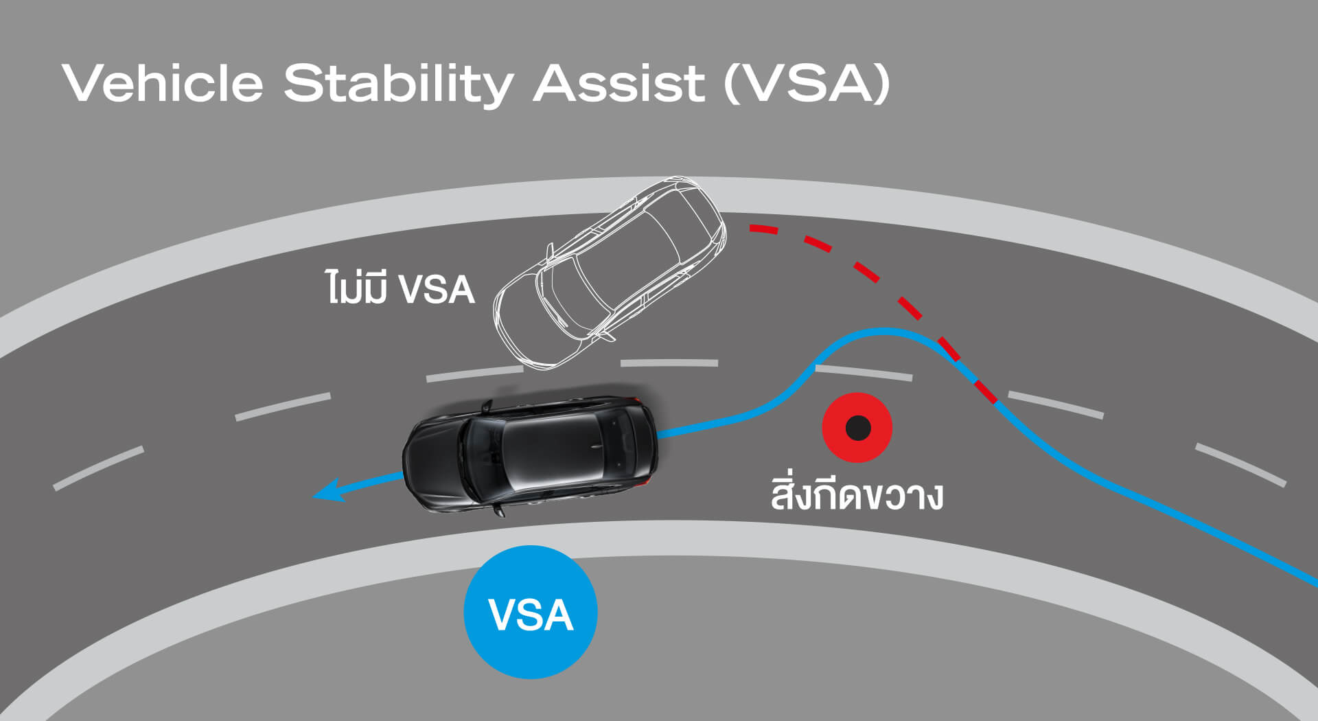 - เข้าโค้งอย่างปลอดภัย การเข้าโค้งในขณะที่ฝนตก ถนนลื่นนั้นจะต้องใช้ความระมัดระวังอย่างยิ่งเลยนะครับ ควรชะลอความเร็วให้ช้าลงในขณะเข้าโค้ง และระมัดระวังอย่าตีวงมากจนเกินไปเพราะอาจจะทำให้ท้ายรถเกิดอาการส่ายได้ครับ และในรถยนต์ฮอนด้าจะมีระบบช่วยควบคุมการทรงตัวขณะเข้าโค้ง Vehicle Stability Assist (VSA) ที่เพิ่มความยึดเกาะถนน โดยหากเซนเซอร์ตรวจจับแล้วพบว่ารถมีความเสี่ยงที่จะเสียการทรงตัวอย่างเช่น การหมุนหรือหลุดโค้ง ระบบจะประมวลผลและสั่งงานให้กระจายแรงเบรกไปยังล้อทั้ง 4 เพื่อที่จะสร้างสมดุลให้รถอยู่ในระดับที่ควบคุมได้ ซึ่งจะช่วยให้รถมีการทรงตัวที่ดีขึ้น แต่อย่างไรก็ตามควรขับขี่ด้วยความระมัดระวังนะครับ ไม่ควรขับขี่ด้วยความเร็วที่เร็วจนเกินไป