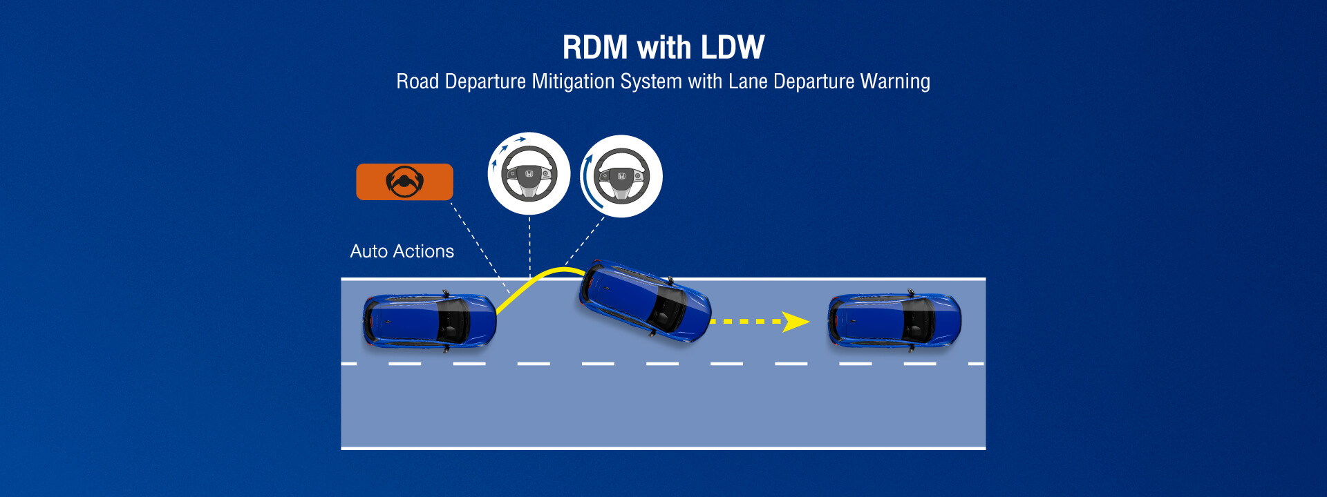 - ระบบเตือนและช่วยควบคุมเมื่อรถออกนอกช่องทางเดินรถ (Road Departure Mitigation System with Lane Departure Warning : RDM with LDW)