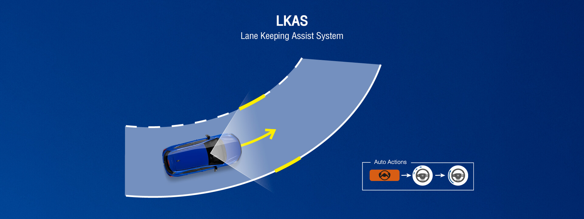 เป็นระบบจะใช้กล้องด้านหน้าในการตรวจจับเส้นแบ่งช่องทางจราจร หากพบว่ารถอยู่ในสภาวะเบี่ยงออกนอกช่องทางโดยไม่ตั้งใจ ระบบจะส่งสัญญาณเตือนที่หน้าจอแสดงข้อมูลพร้อมการสั่นเตือนของพวงมาลัย และในกรณีที่รถเริ่มเบี่ยงออกนอกช่องทางมากยิ่งขึ้น ระบบจะช่วยหน่วงพวงมาลัย เพื่อให้รถกลับเข้าสู่ช่องทางปกติ ช่วยลดความเสี่ยงที่รถจะออกนอกช่องทางจราจร