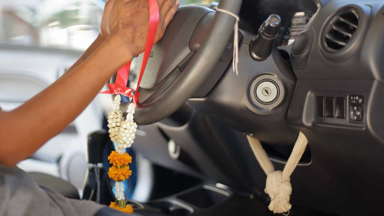 การผูกหรือคล้องสายสิญจน์ที่คอพวงมาลัยไม่ว่าจะเส้นเล็กหรือเส้นใหญ่ เมื่อเวลาผ่านไปสักระยะสายสิญจน์อาจเข้าไปพันที่ขดลวดคอพวงมาลัยได้ เพราะว่าชุดคอพวงมาลัยและชุดพวงมาลัยจะมีรอยต่อที่มีช่องว่างอยู่ เมื่อเวลาหมุนพวงมาลัยอาจทำให้สายสิญจน์เกิดการขยับตัว และแทรกเข้าไปยู่ในชุดแผงวงจรขดลวดคอพวงมาลัยได้ ทำให้เกิดการขาดวงจร และอาจมีรูปสัญญาณเตือนโชว์ นอกจากนี้แตรจะไม่ทำงานอีกด้วย หรืออีกเหตุการณ์หนึ่งอาจเข้าไปพันและติดจนพวงมาลัยทำให้หมุนไม่ได้ในขณะที่กำลังขับขี่ อันตรายสุดๆ