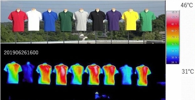 โดยเสื้อสีขาวจะมีอุณหภูมิประมาณ 30 องศาเซลเซียส ส่วนเสื้อสีดำจะมีอุณหภูมิอยู่ที่ 50 องศาเซลเซียสสำหรับผลลัพธ์ที่ได้ค่อนข้างที่จะประหลาดใจ เพราะหลายคนอาจจะมองว่า เสื้อสีเหลืองและสีแดง เป็นโทนสีที่ร้อน เมื่อใส่น่าจะรู้สึกว่าร้อนมากกว่า โดยเฉพาะเสื้อสีแดงที่เป็นสีแห่งความร้อนแรงทางจิตวิทยา แต่ความเป็นจริงกลับให้ความเย็นที่มากกว่าที่คิดซะอีก