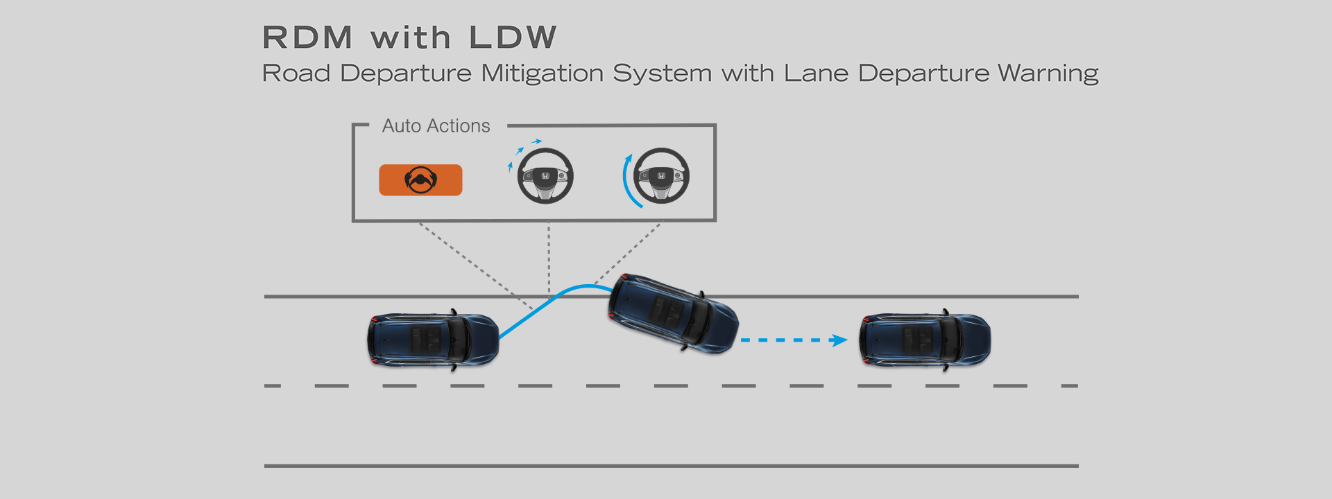 - ระบบเตือนและช่วยควบคุมเมื่อรถออกนอกช่องทางเดินรถ (Road Departure Mitigation System with Lane Departure Warning : RDM with LDW)
