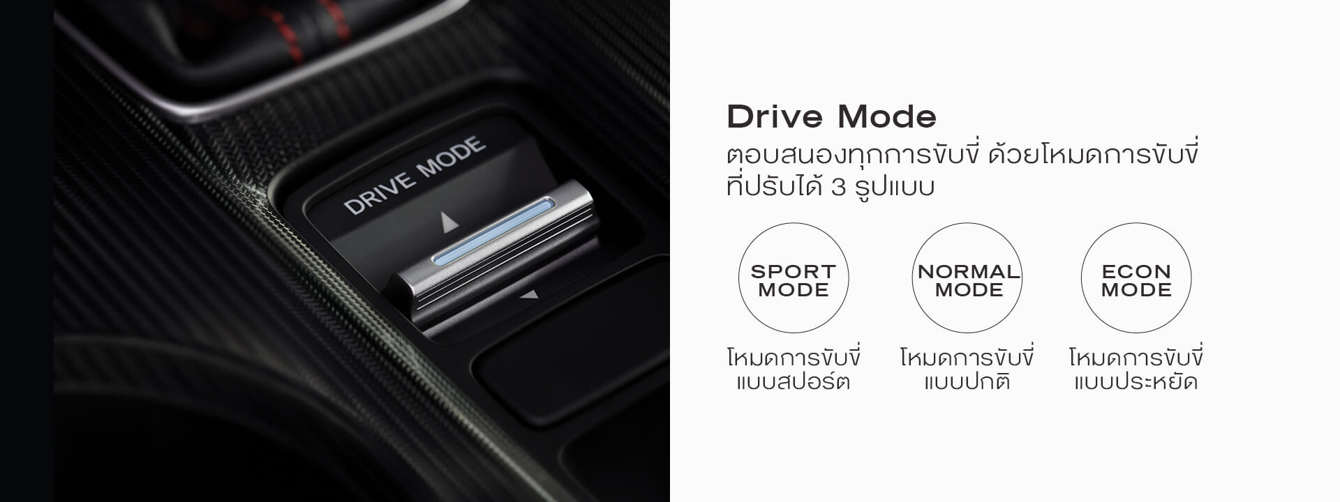 - ECON Mode โหมดการขับขี่แบบประหยัด พร้อมปรับการทำงานของเครื่องยนต์ให้สัมพันธ์กับการขับขี่เพื่ออัตราการประหยัดเชื้อเพลิงมากขึ้น