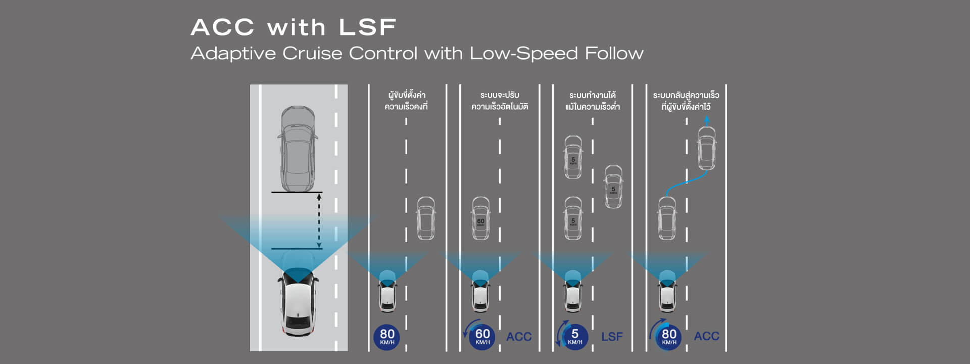 - ระบบควบคุมความเร็วอัตโนมัติแบบแปรผัน พร้อมระบบปรับความเร็วตามรถยนต์คันหน้าที่ความเร็วต่ำ (Adaptive Cruise Control with Low-Speed Follow: ACC with LSF)