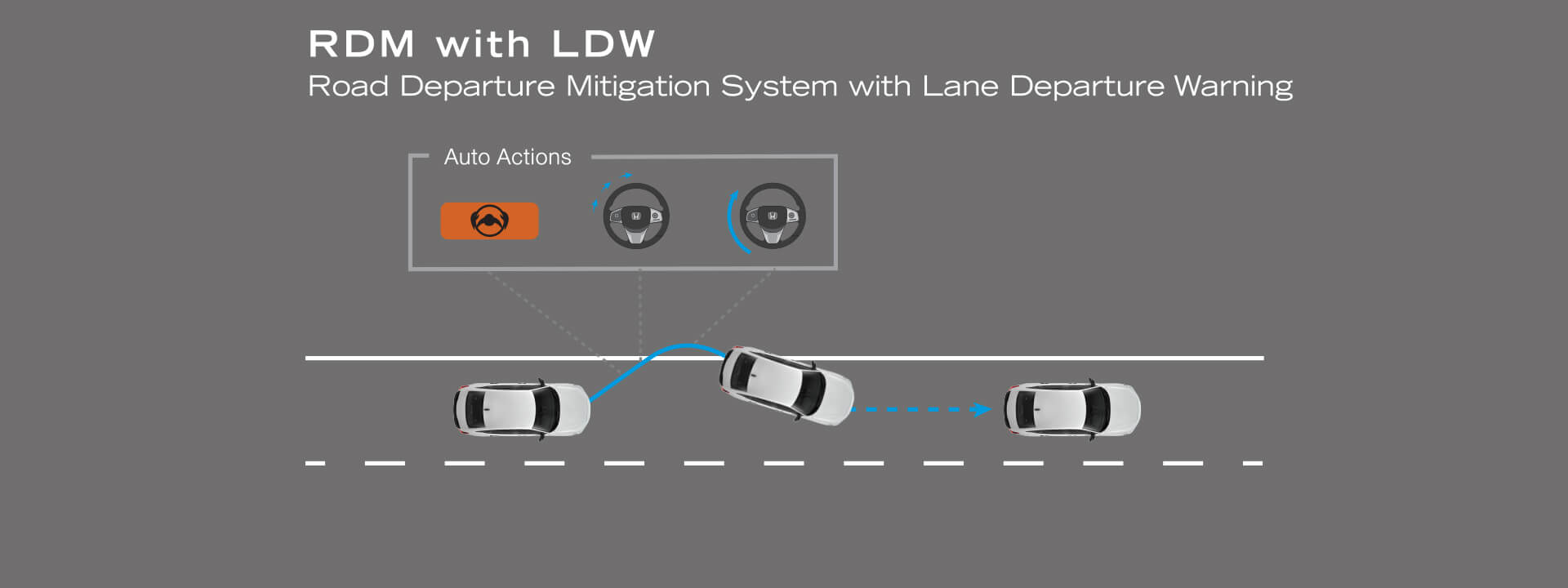 - ระบบเตือนและช่วยควบคุมเมื่อรถออกนอกช่องทางเดินรถ (Road Departure Mitigation System with Lane Departure Warning: RDM with LDW)