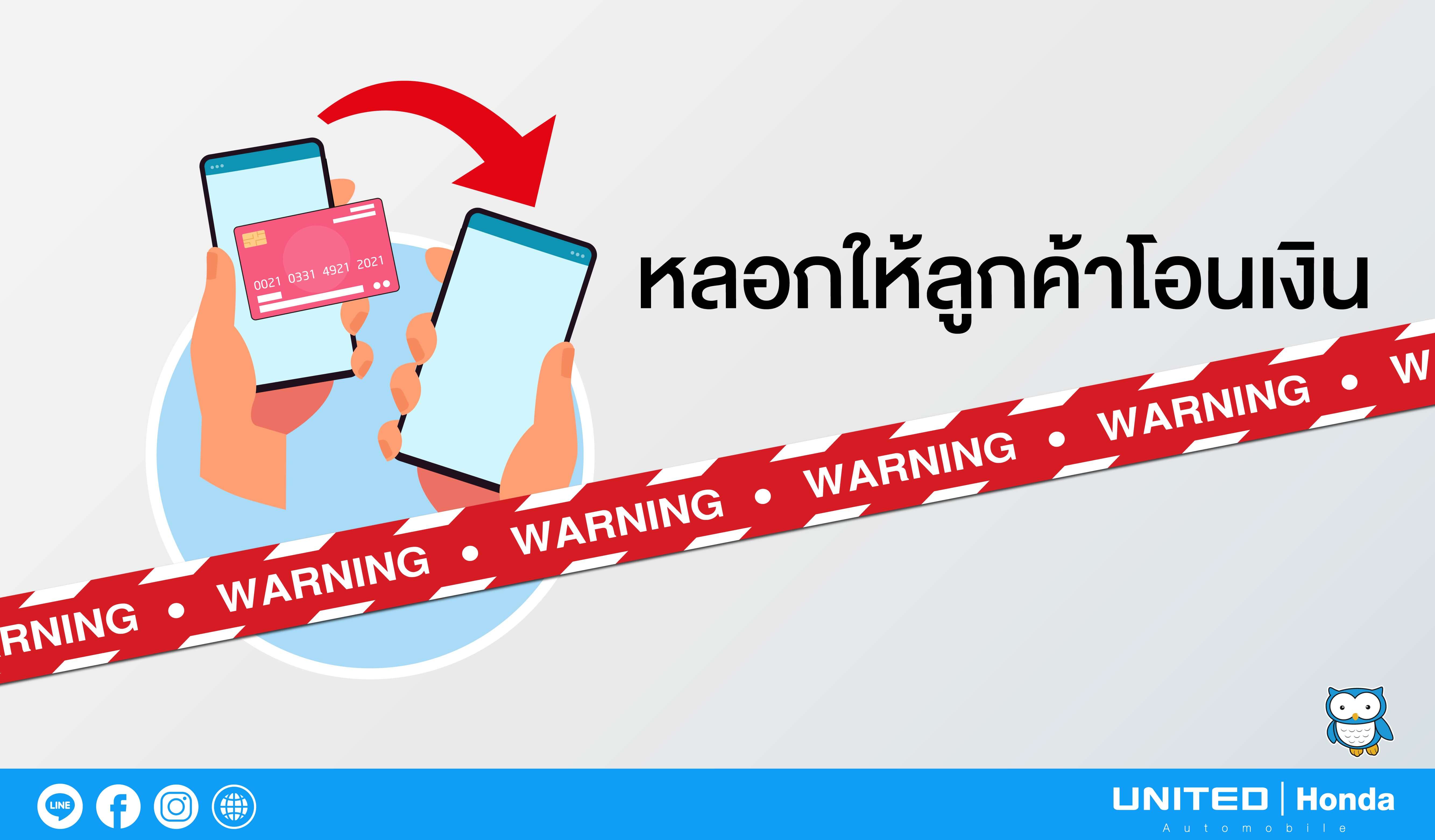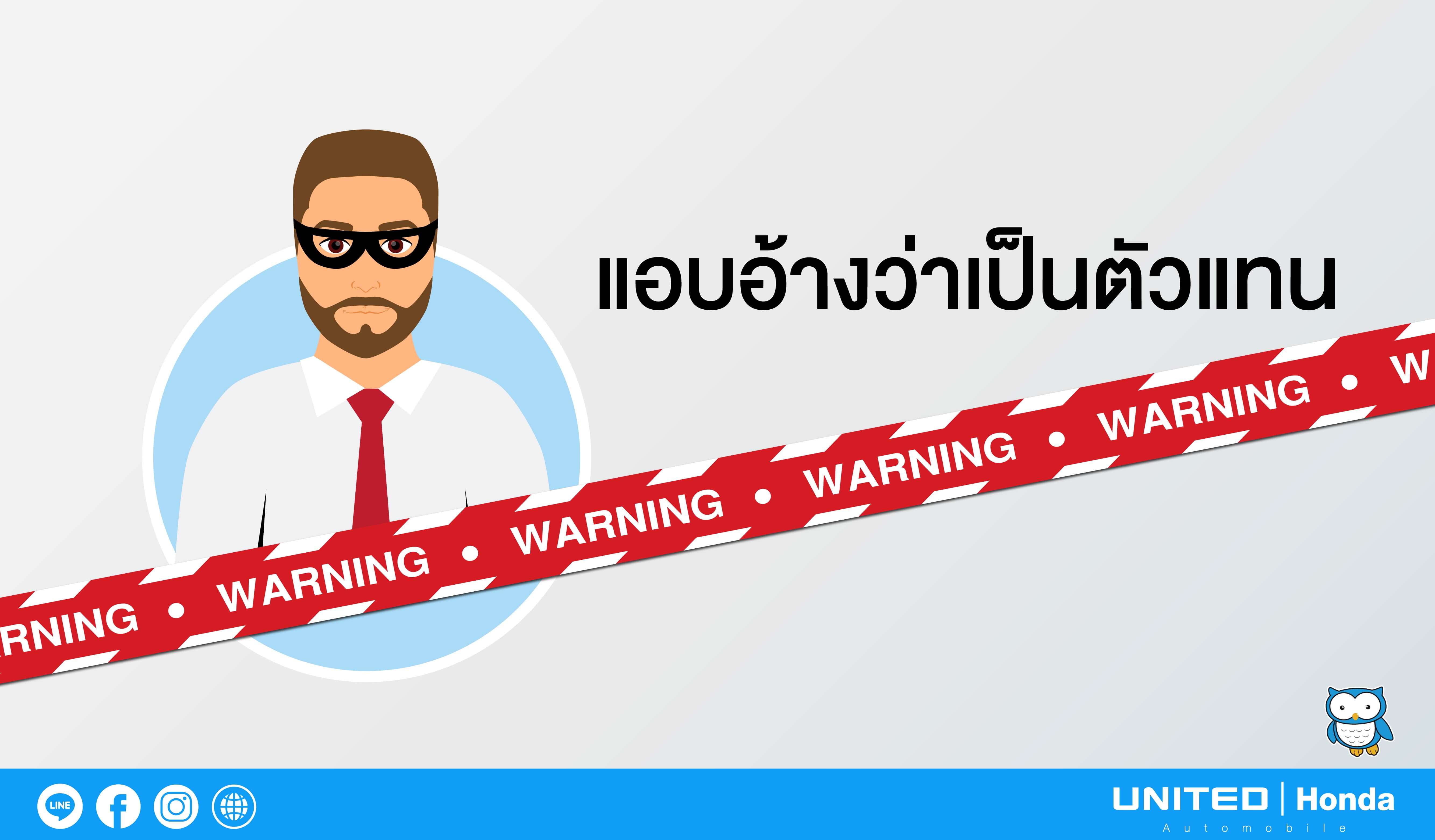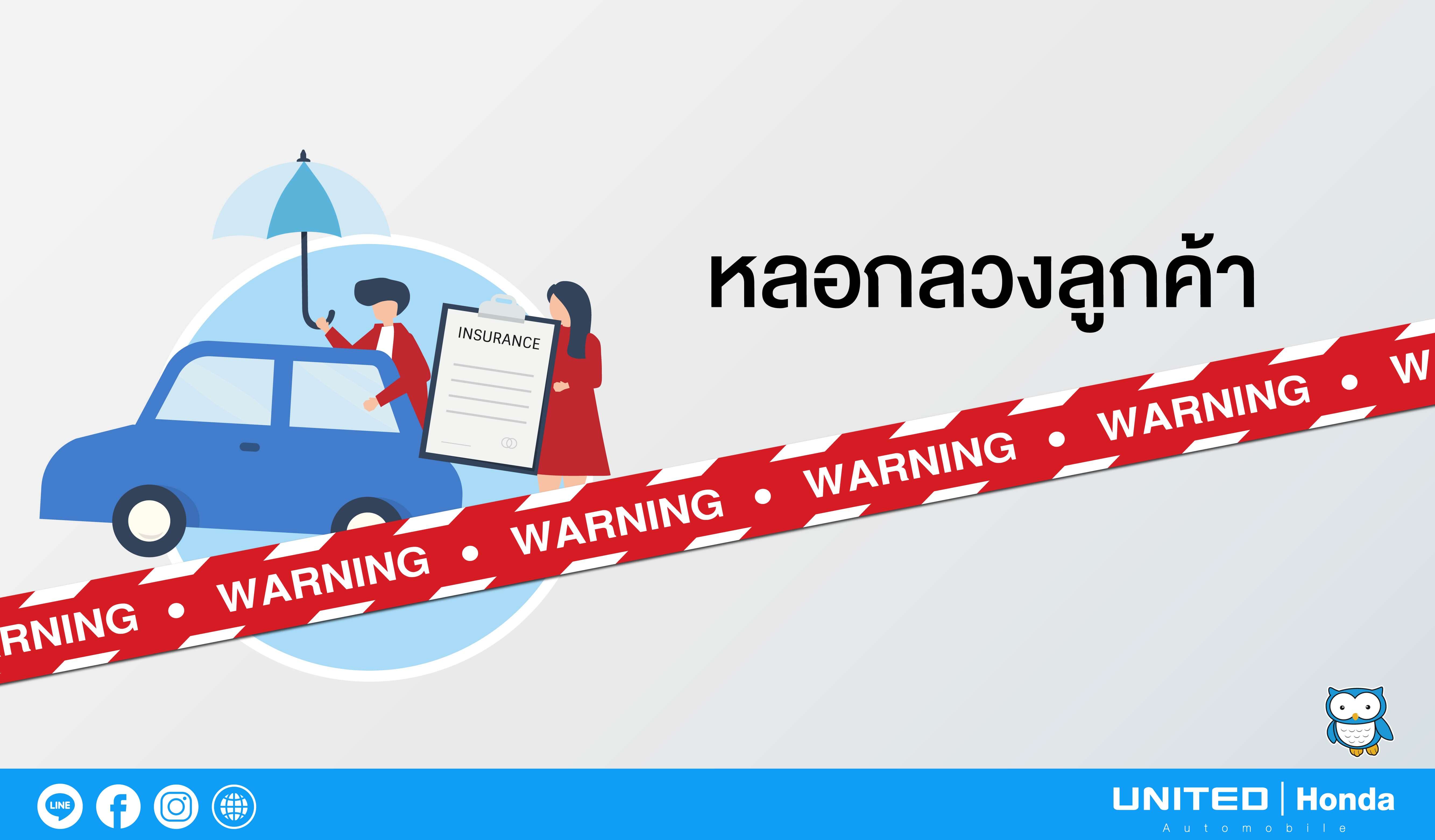การแอบอ้างว่าเป็นตัวแทนของบริษัทประกันภัยที่ได้รับอนุญาตจากฮอนด้า ควรระวังมากๆ เลยนะครับเพราะถ้าหากเกิดเชื่อในสิ่งที่เขาแอบอ้างมานั้นอาจจะนำไปสู่ความเสียหายได้