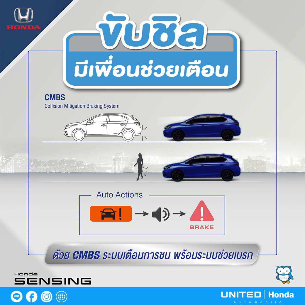 กังวลทุกครั้งเมื่อต้องขับออกถนน ด้วยความที่ยังมือใหม่จึงเกิดความกังวลไม่น้อยแต่หมดห่วงได้เลยครับเพราะในรถยนต์ ฮอนด้า รุ่นนี้ได้มีเทคโนโลยีความปลอดภัยอย่าง CMBS : Collision Mitigation Braking System เป็นระบบเตือนการชนพร้อมระบบช่วยเบรก เมื่อมีรถยนต์ จักรยาน หรือคนเดินถนนที่อยู่ในระยะไม่ปลอดภัย โดยระบบจะแจ้งเตือนผ่านหน้าจอแสดงข้อมูลและสัญญาณเสียง รวมถึงมีการสั่นเตือนของพวงมาลัยในกรณีรถสวนทาง ซึ่งหากผู้ขับขี่ยังไม่ตอบสนองหรือในกรณีที่อยู่ในระยะเสี่ยงต่อการชนระบบจะช่วยเสริมแรงเบรกอัตโนมัติ เพื่อหลีกเลี่ยงการชนหรือลดความรุนแรงจากอุบัติเหตุ