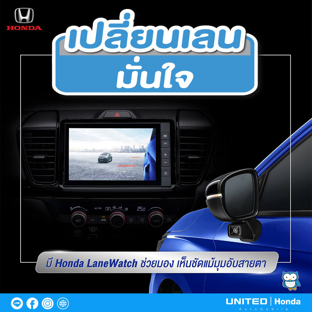 จะเปลี่ยนเลนทีไรก็กล้าๆ กลัวๆ ไม่มั่นใจว่าสามารถเปลี่ยนเลนได้หรือไม่ จะมีรถมาหรือไม่ และยิ่งเป็นมุมอับสายตาแล้วด้วยนั้นก็จะยิ่งกังวล มาเปลี่ยนเลนได้อย่างมั่นใจกันดีกว่าครับด้วย Honda LaneWatch เป็นระบบแสดงภาพมุมอับสายตาขณะเปลี่ยนเลน ลดจุดบอดในการมองเห็นของกระจกมองข้างด้านซ้าย โดยจะใช้กล้องในการจับภาพ และแสดงผลผ่านหน้าจอขนาด 8 นิ้ว ทุกครั้งที่เปิดไฟเลี้ยวซ้ายหรือกดปุ่มที่ก้านไฟเลี้ยวนั่นเองครับ