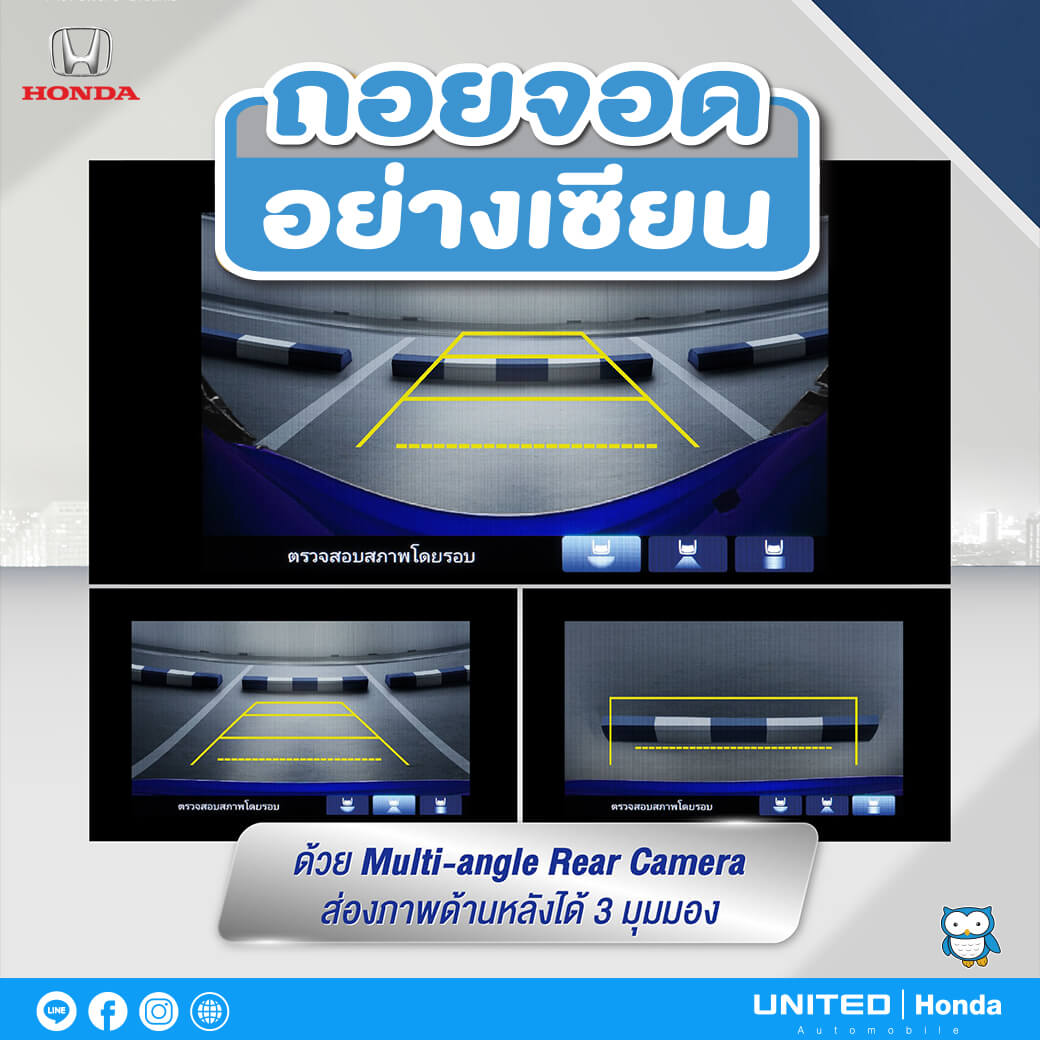 การถอยจอดเรียกได้ว่าเป็นโจทย์ยากอันดับต้นๆ เลยก็ว่าได้สำหรับมือใหม่ แต่ไม่เป็นไรนะครับเพราะในรถยนต์ ฮอนด้า รุ่นนี้ได้มี Multi-angle Rear Camera มาให้ ด้วยกล้องส่องภาพด้านหลังที่สามารถปรับมุมมองภาพได้ถึง 3 ระดับ ทั้งแบบ 130 องศา, 180 องศา และมุมมองจากด้านบน โดยแสดงผลผ่านหน้าจอ 8 นิ้ว ช่วยให้คุณเห็นได้อย่างชัดเจน ทำให้ถอยจอดได้ง่ายขึ้นครับ