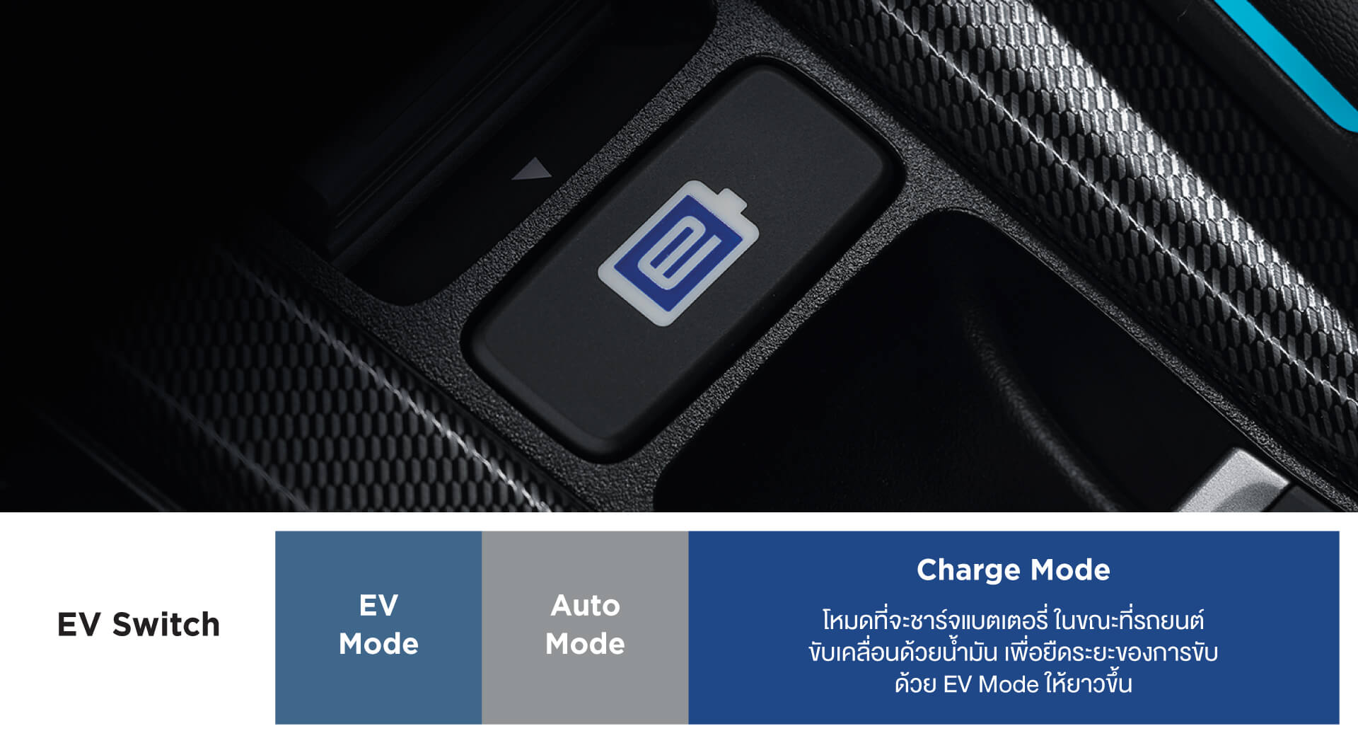 - EV Mode ระบบจะขับเคลื่อนด้วยมอเตอร์ไฟฟ้าเท่านั้น