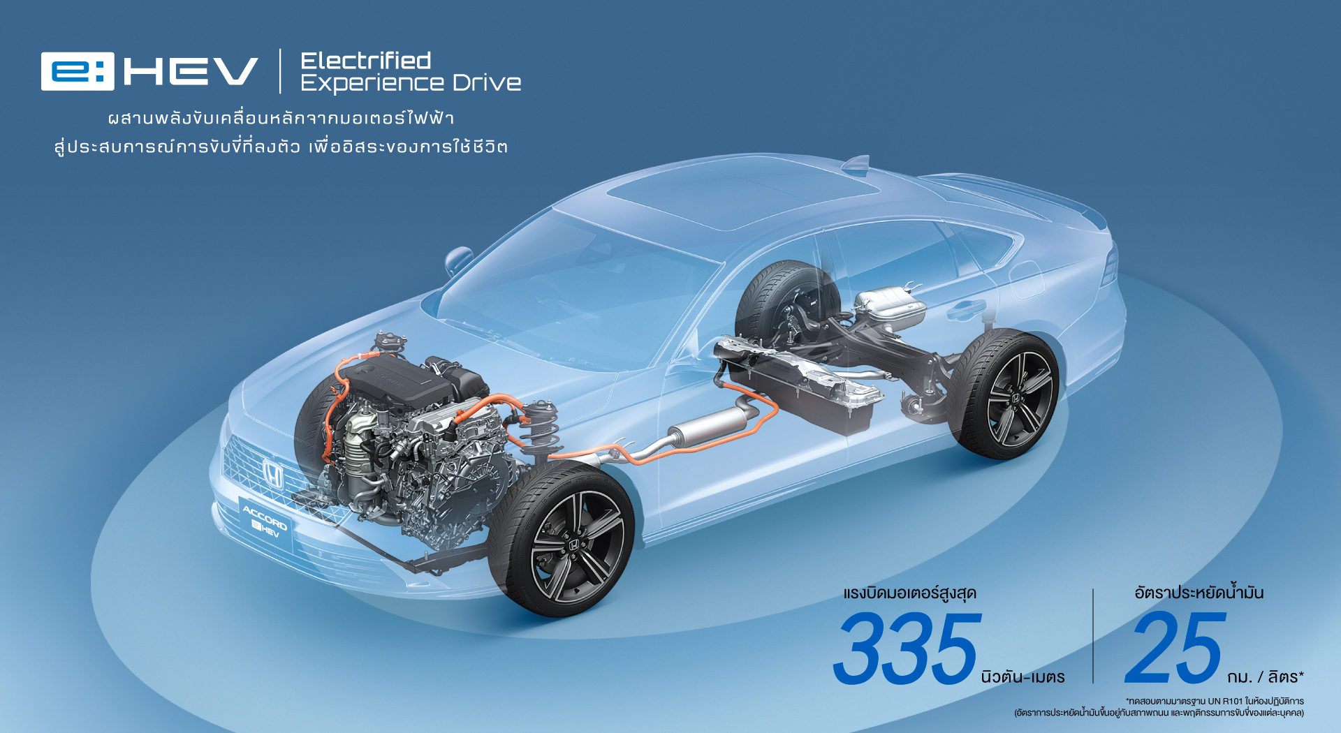 หัวใจของรถยนต์ ฮอนด้า แอคคอร์ด อี:เอชอีวี ก็คือขุมพลังมอเตอร์ไฟฟ้าแรงบิดสูงสุด 355 นิวตัน-เมตร และแบตเตอรี่ลิเธียม-ไอออนที่มีประสิทธิภาพสูง ผสานการทำงานกับเครื่องยนต์ขนาด 2.0 ลิตร Direct injection เปิดประสบการณ์ขับขี่ที่ทรงพลัง แรง ตอบสนองดั่งใจ มอบอัตราการประหยัดน้ำมันที่ดีเยี่ยม ทั้งยังเป็นมิตรต่อสิ่งแวดล้อม ด้วยการปล่อยก๊าซคาร์บอนไดออกไซด์ต่ำ เพื่อโลกที่ดีกว่าในอนาคต