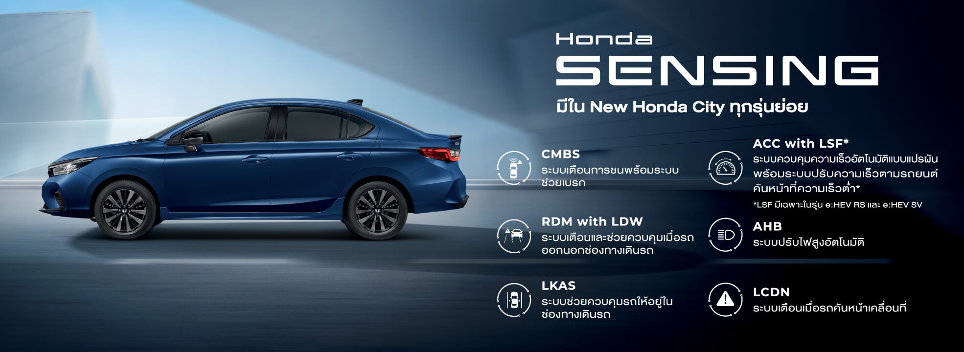 ไม่ต้องจ่ายเพิ่มเพื่อความปลอดภัย เพราะ Honda City e:HEV ติดตั้งระบบ Honda SENSING มาให้ครบทุกรุ่นย่อย เช่น
