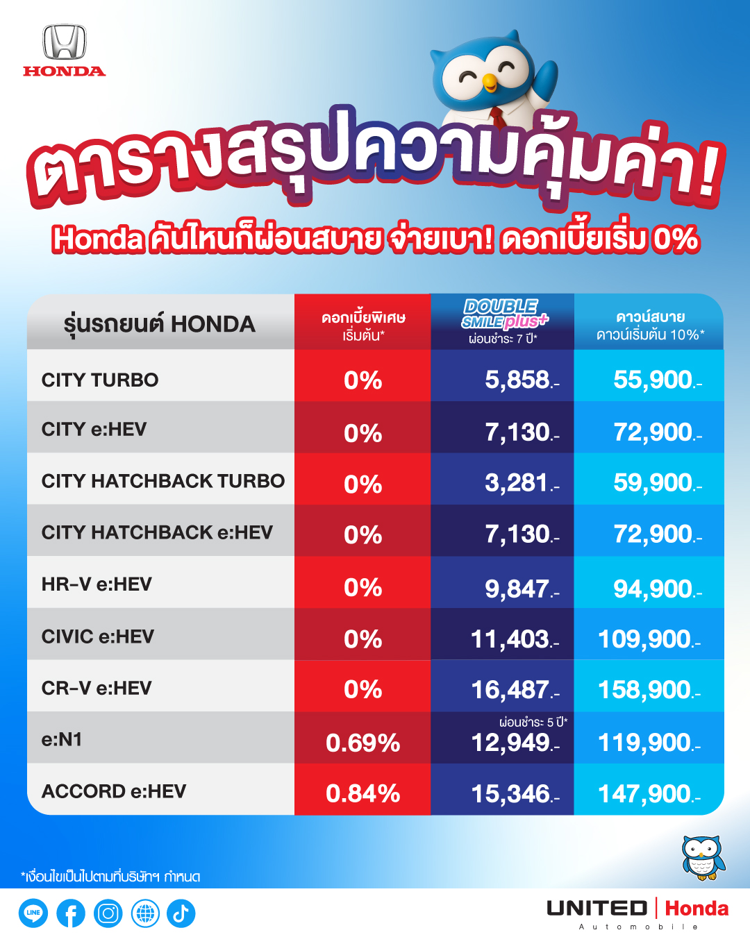 หากคุณกำลังมองหารถยนต์ซิตี้คาร์ที่ตอบโจทย์ทั้งความแรงและความประหยัด ในปี 2026 นี้ไม่มีดีลไหนจะร้อนแรงไปกว่า โปรโมชั่น Honda City Turbo ที่ ยูไนเต็ดฮอนด้า อีกแล้ว! กับแคมเปญสุดช็อก "โปรตะลึง ตรึงราคา" ที่มอบส่วนลดเงินสดสูงสุดถึง 85,000 บาท พร้อมสิทธิพิเศษที่ช่วยให้คุณเป็นเจ้าของรถได้ง่ายกว่าที่เคย Honda City Turbo ยังคงครองใจผู้ใช้รถชาวไทยด้วยเครื่องยนต์ 1.0 ลิตร VTEC TURBO ที่ให้สมรรถนะการขับขี่ที่สนุกเร้าใจเทียบเท่าเครื่องยนต์ขนาด 1.5 ลิตร แต่ประหยัดน้ำมันสูงสุดถึง 23.8 กม./ลิตร นอกจากนี้ยังมาพร้อมกับเทคโนโลยีความปลอดภัย Honda SENSING ในทุกรุ่นย่อย ราคาพิเศษหลังหักส่วนลด 85,000 บาท ข้อเสนอ Double Smile Plus ผ่อนเบา ดาวน์สบาย เลือกผ่อนได้ ตามสไตล์ที่คุณชอบ ฮอนด้าช่วยผ่อน 7 ปี