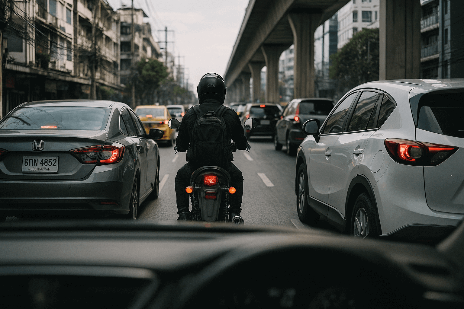 ในขณะที่เรากำลังขับรถอยู่บนถนนสุขุมวิท ในสภาพที่รถติดสลับหยุดนิ่ง ได้มีมอเตอร์ไซค์หลายคันวิ่งแทรกด้านข้าง
