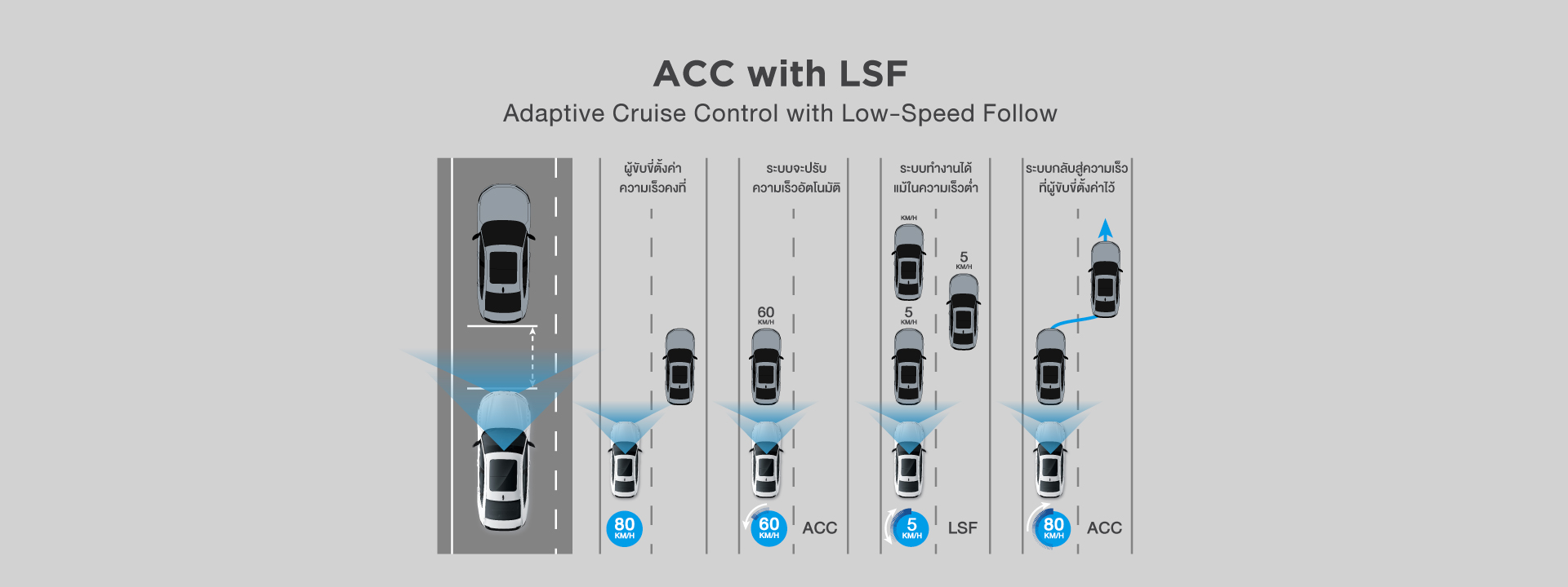 - ระบบควบคุมความเร็วอัตโนมัติแบบแปรผัน พร้อมระบบปรับความเร็วตามรถยนต์คันหน้าที่ความเร็วต่ำ (Adaptive Cruise Control with Low-Speed Follow: ACC with LSF) เป็นระบบช่วยควบคุมความเร็วของรถให้คงที่ตามที่ผู้ขับขี่ตั้งค่าไว้ และระบบจะปรับความเร็วอัตโนมัติ โดยมีกล้องตรวจจับรถคันหน้าเพื่อรักษาระยะห่างจากรถคันหน้าอย่างเหมาะสม และในการขับขี่ที่ความเร็วต่ำ ระบบจะช่วยปรับความเร็วให้รถเคลื่อนที่ตามรถคันหน้า รวมถึงเบรกและหยุดตามอัตโนมัติ ระบบจะเริ่มทำงานอีกครั้งเมื่อผู้ขับขี่กดปุ่มที่พวงมาลัยหรือเหยียบคันเร่ง