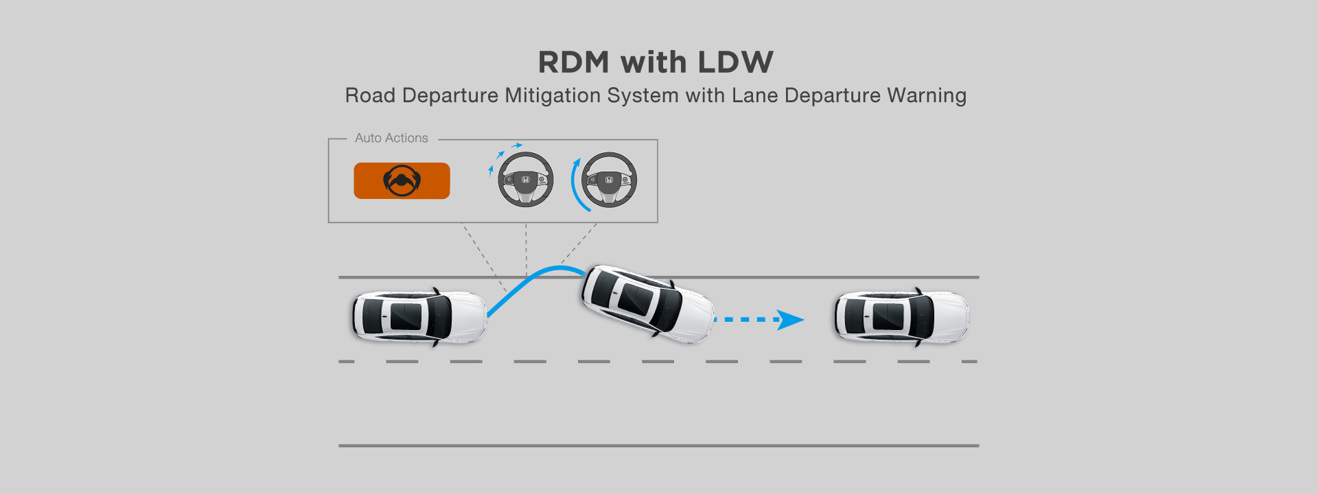 - ระบบเตือนและช่วยควบคุมเมื่อรถออกนอกช่องทางเดินรถ (Road Departure Mitigation System with Lane Departure Warning: RDM with LDW) เป็นระบบจะใช้กล้องด้านหน้าในการตรวจจับเส้นแบ่งช่องทางจราจร หากพบว่ารถอยู่ในสภาวะเบี่ยงออกนอกช่องทางโดยไม่ตั้งใจ ระบบจะส่งสัญญาณเตือนที่หน้าจอแสดงข้อมูลพร้อมการสั่นเตือนของพวงมาลัย และในกรณีที่รถเริ่มเบี่ยงออกนอกช่องทางมากยิ่งขึ้น ระบบจะช่วยหน่วงพวงมาลัย เพื่อให้รถกลับเข้าสู่ช่องทางปกติ ช่วยลดความเสี่ยงที่รถจะออกนอกช่องทางจราจร