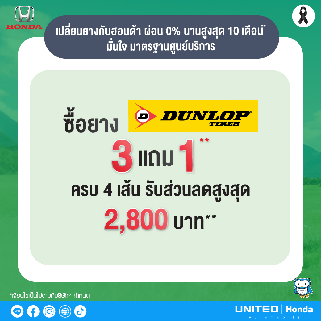 - ยาง Dunlop ซื้อ 3 แถม 1*, หรือซื้อครบ 4 เส้น รับส่วนลด 600-2,800 บาท*