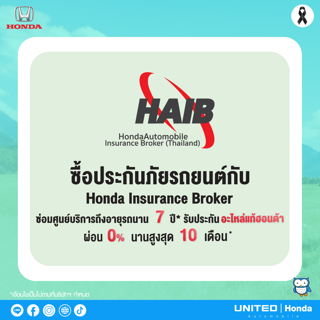 ซื้อประกันภัยรถยนต์กับ Honda Insurance Broker ซ่อมศูนย์บริการถึงอายุรถนาน 7 ปี* รับประกันอะไหล่แท้ฮอนด้า พร้อมผ่อน 0% นานสูงสุด 10 เดือน*