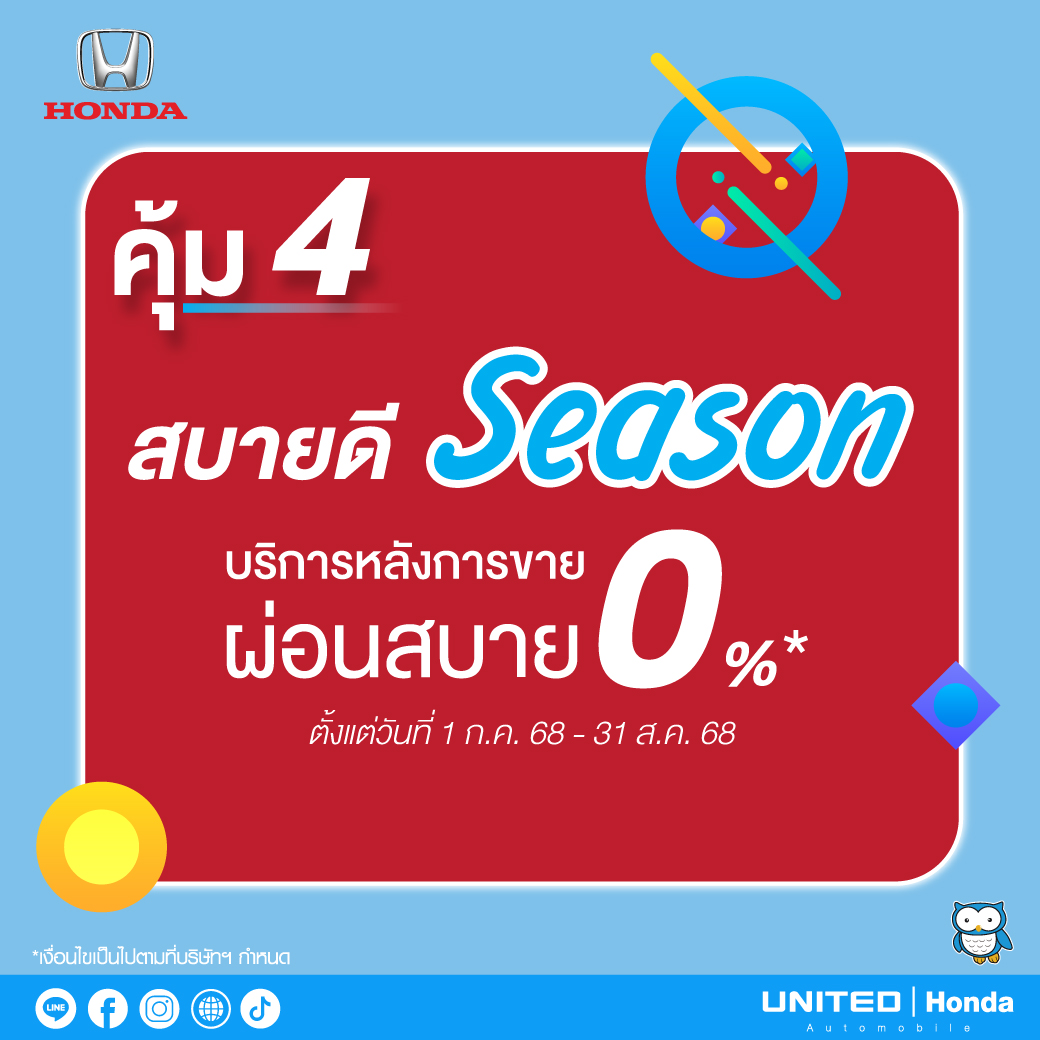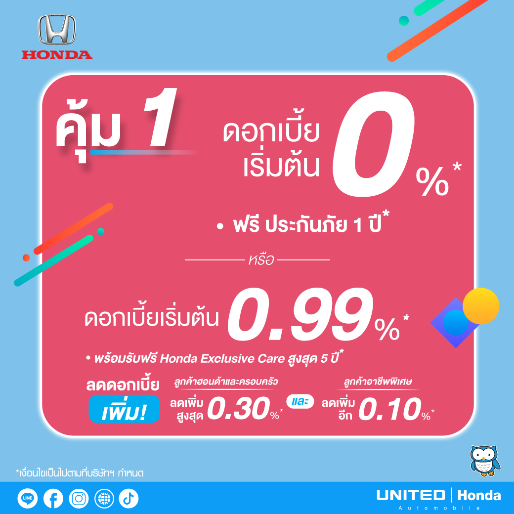 - ดอกเบี้ยเริ่ม 0.99%* พร้อมฟรี Honda Exclusive Care สูงสุด 5 ปี*