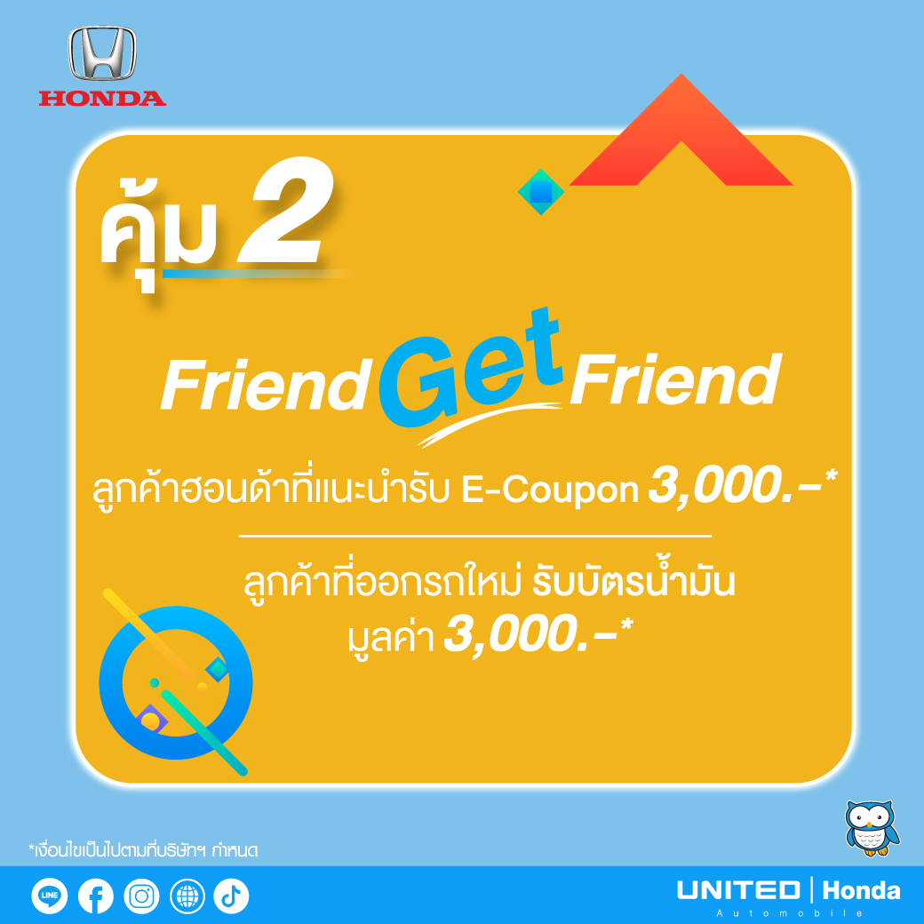 - Friend Get Friend ลูกค้าฮอนด้าชวนเพื่อนมาออกรถใหม่ รับ E-Coupon 3,000 บาท*