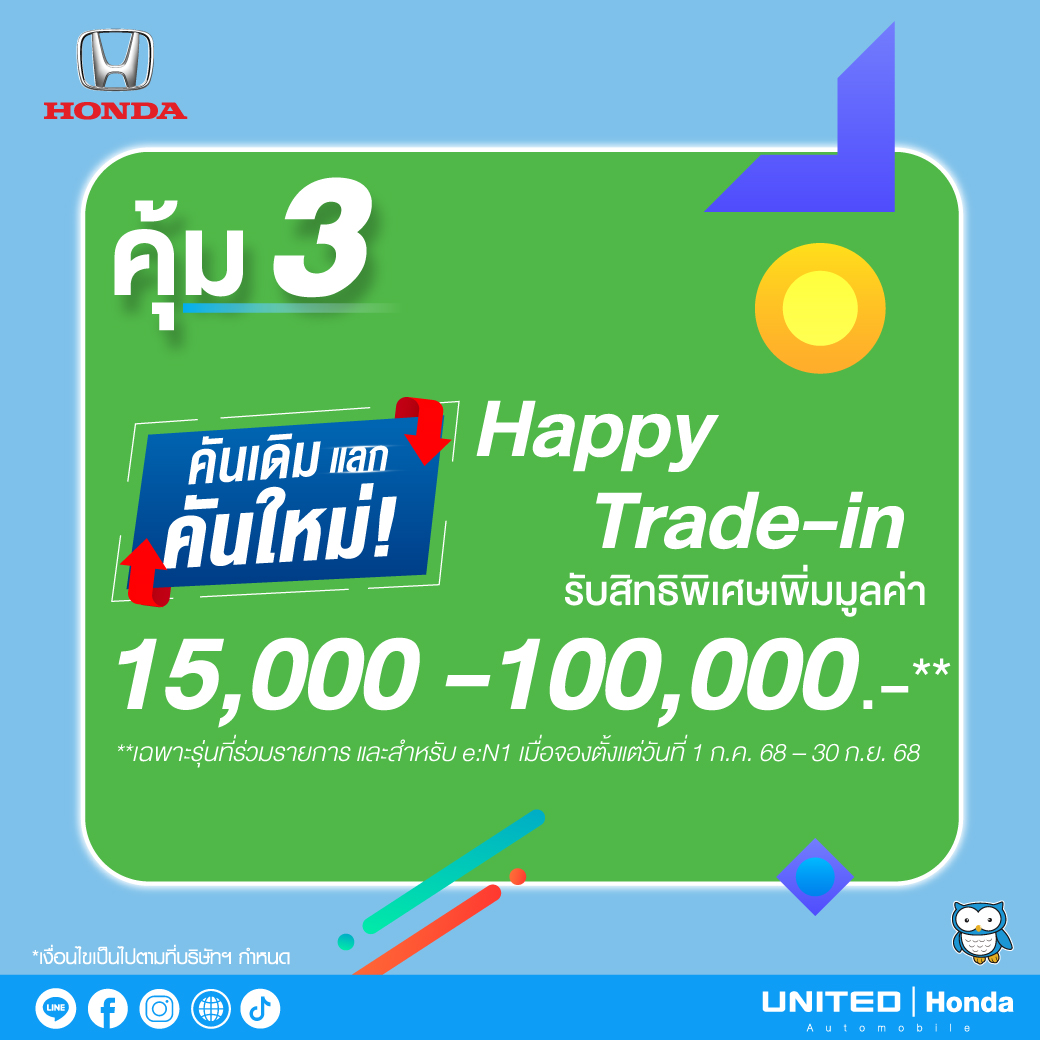 - Happy Trade-in เทิร์นรถใหม่กับฮอนด้า รับสิทธิพิเศษเพิ่มมูลค่า 15,000 - 100,000 บาท*