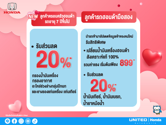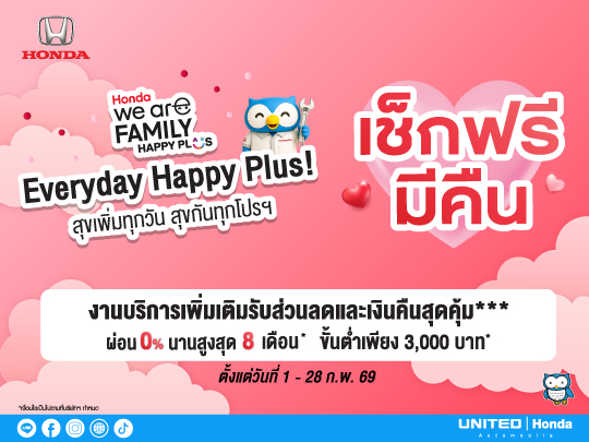 ยูไนเต็ด ฮอนด้า มอบความสุขให้คนรักรถตลอดเดือนกุมภาพันธ์นี้! กับแคมเปญสุดพิเศษ "Everyday Happy Plus! สุขเพิ่มทุกวัน สุขกันทุกโปรฯ" ที่รวมทุกความคุ้มค่ามาไว้ที่เดียว ไม่ว่าจะเป็นบริการเช็กระยะ เปลี่ยนยางรถยนต์ หรือสิทธิพิเศษสำหรับรถฮอนด้ามือสอง เราพร้อมดูแลรถคุณด้วยมาตรฐานศูนย์บริการระดับมืออาชีพ