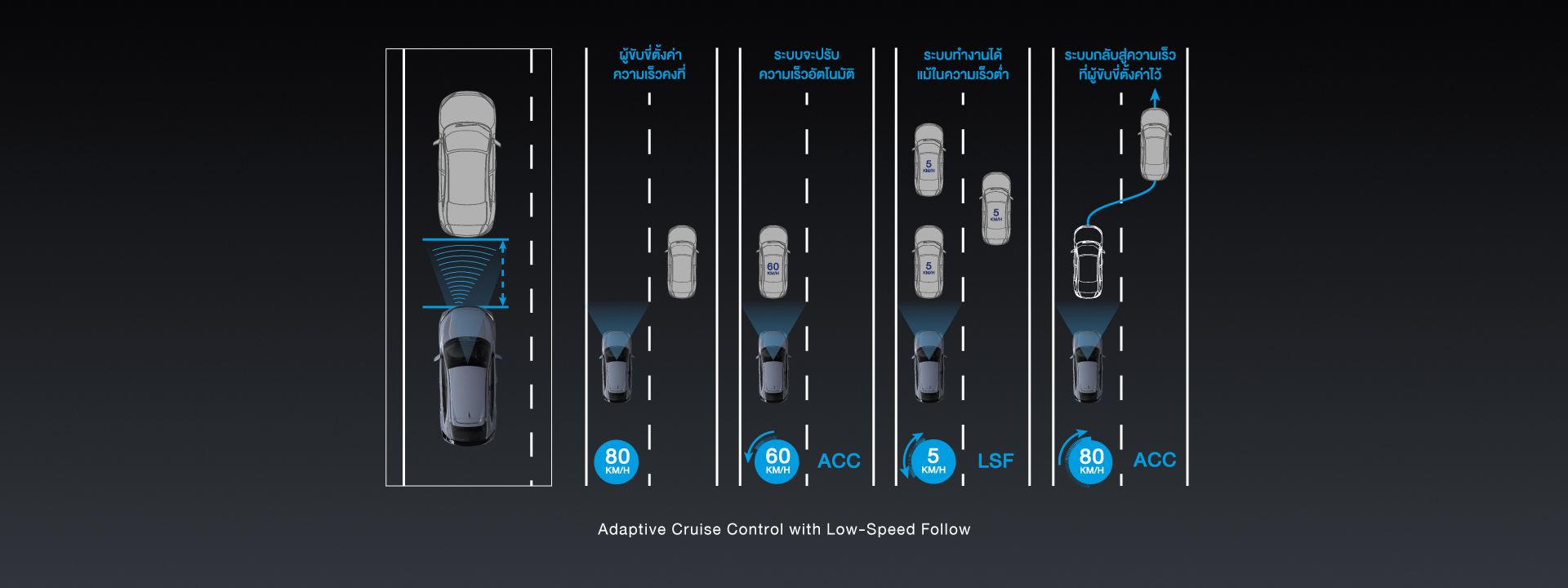 - ระบบควบคุมความเร็วอัตโนมัติแบบแปรผัน พร้อมระบบปรับความเร็วตามรถยนต์คันหน้าที่ความเร็วต่ำ (Adaptive Cruise Control with Low-Speed Follow : ACC with LSF)